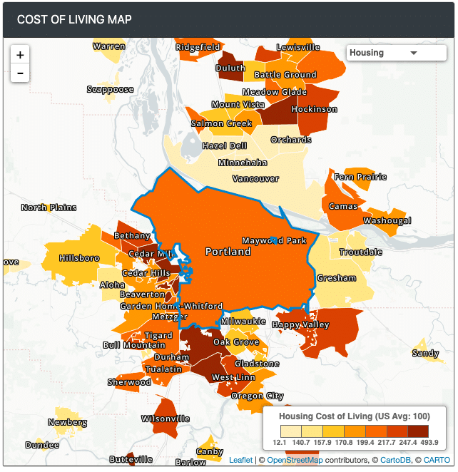 - Living in the ‘burbs. Housing costs are high in Portland and some surrounding communities, but not all. Sperling’s Best Places calculates a “Cost of Living Index”, where 100 is the US average. Portland rates a 130.8 overall, and 181.5 for the housing cost of living. However, surrounding communities have significantly lower rates, both overall and for housing specifically.
