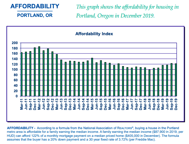 Taking a look at the bigger picture, the supply of single-family homes on the market this spring is tight. Then again, the National Association of Realtors considers the Portland housing market affordable for those earning the median income. The following chart shows the affordability rate over the last decade in Portland.