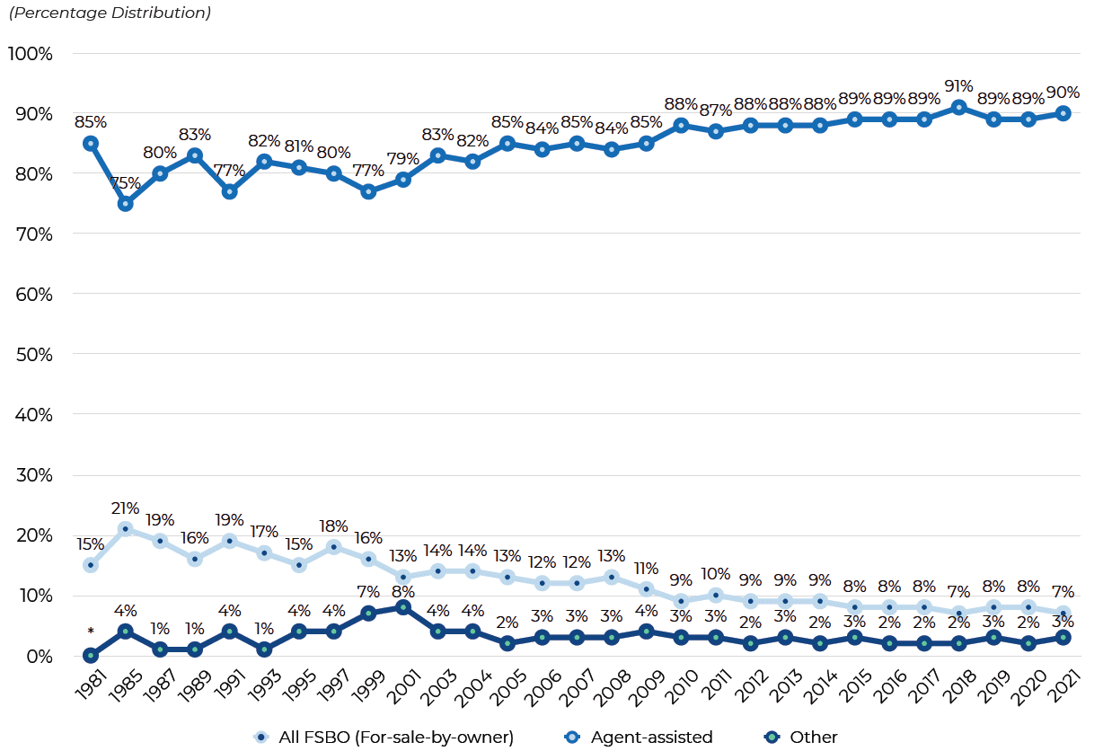 The 7% of FSBO home sales in 2021 was down by 1% from 2020. The For Sale By Owner rate has been steadily dropping since the NAR first began keeping track in 1981 and has stayed relatively the same over the last few years. In 1981, 15% of home sellers chose FSBO instead of using a real estate agent.