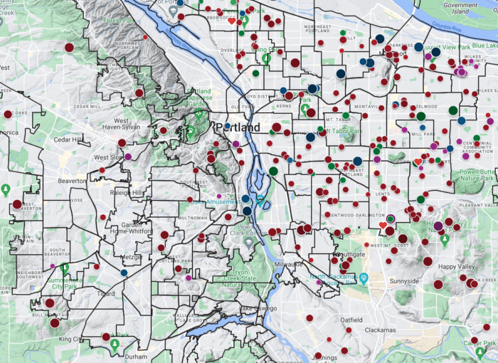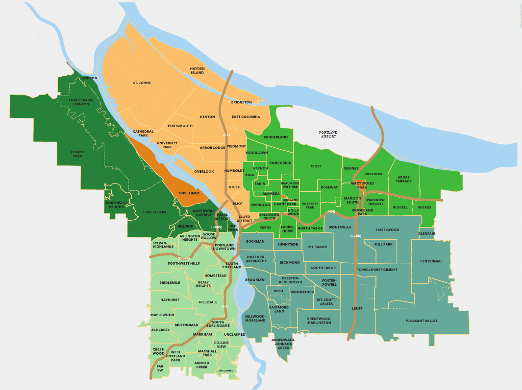 We highly recommend the clickable Portland, Oregon neighborhood map found at PortlandNeighborhood.com. The local neighborhood guides found there are second-to-none and are regularly updated.