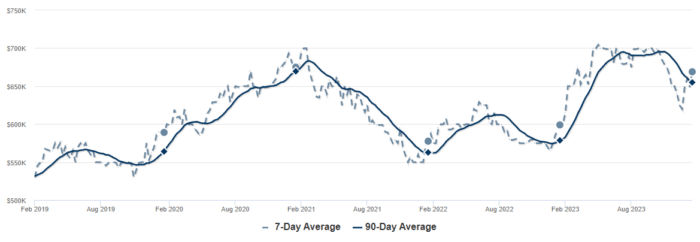 As we can see from the chart below, the the median asking price of a condo in Portland right now is $395,000. Meanwhile the median asking price of a detached home is $668,000, a difference of over $250,000.