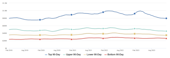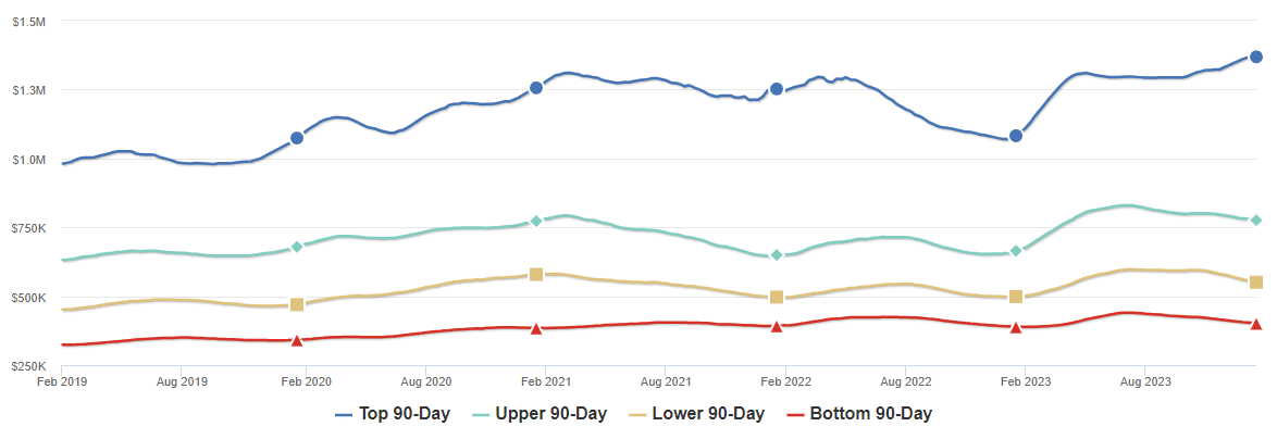 The majority of condos (75%) fall in a price range from just over $200,000 to just under $600,000. It is easy to see that condos haven’t risen much in price in the last few years (if at all). In contrast, detached homes bottom 25% has risen from an average price of $324,000 in 2019 to $401,000 today, a significant jump in pricing for lower cost housing. Condos bottom 25% average sales price was $236,000 in 2019 and is $265,000 today.